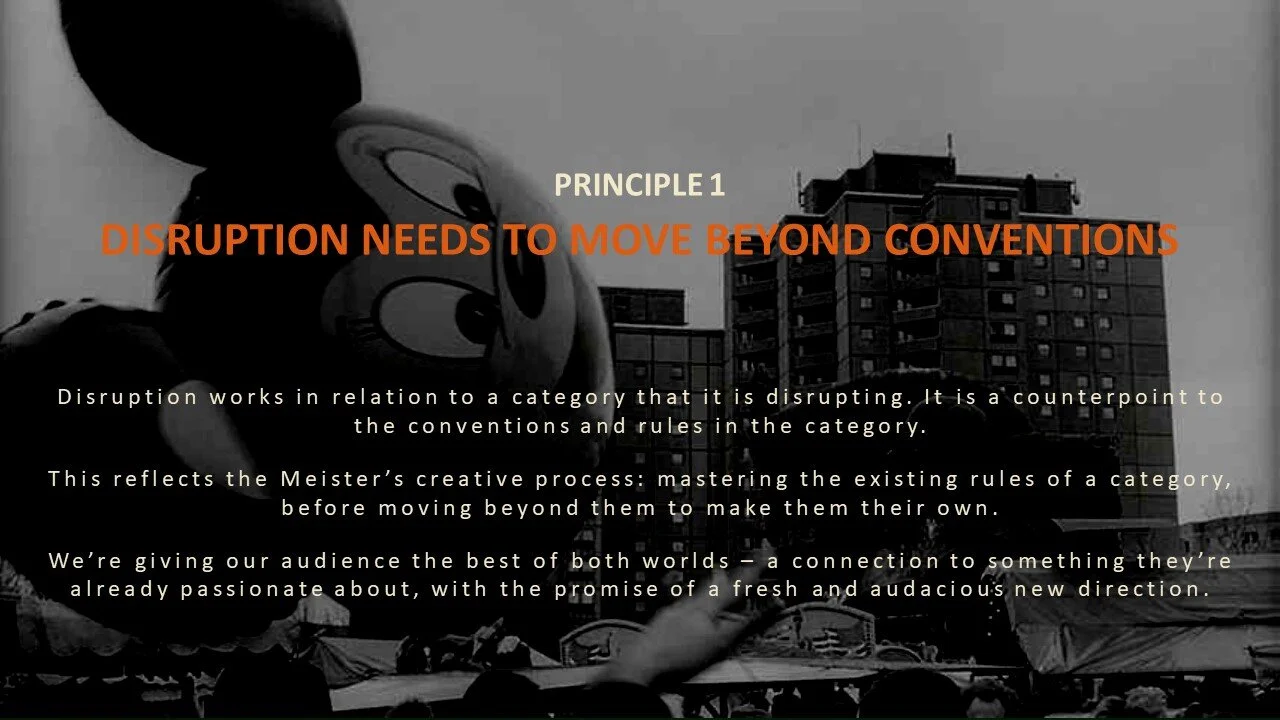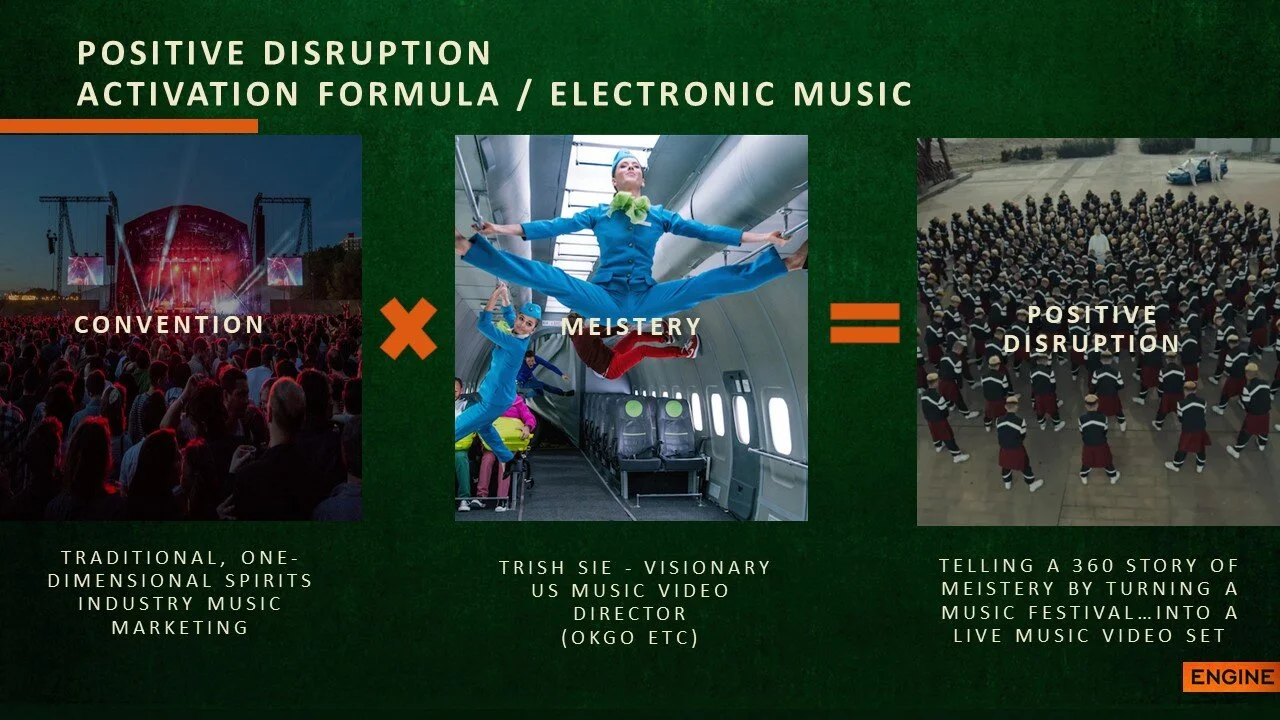 Our role was two-fold: drive reappraisal and support innovation. We developed a global brand platform that would encourage young people to consider Jägermeister earlier in the night as part of a mixer (the kids don’t do late night shots anymore). ‘Be The Meister’ championed disruptive craft: using ambassadors from the world’s of music, fashion, film, sport and mixology to paint a new picture of Jägermeister and where it features in the night. I built the experiential and content framework for this that became the blueprint for all BTL activity.